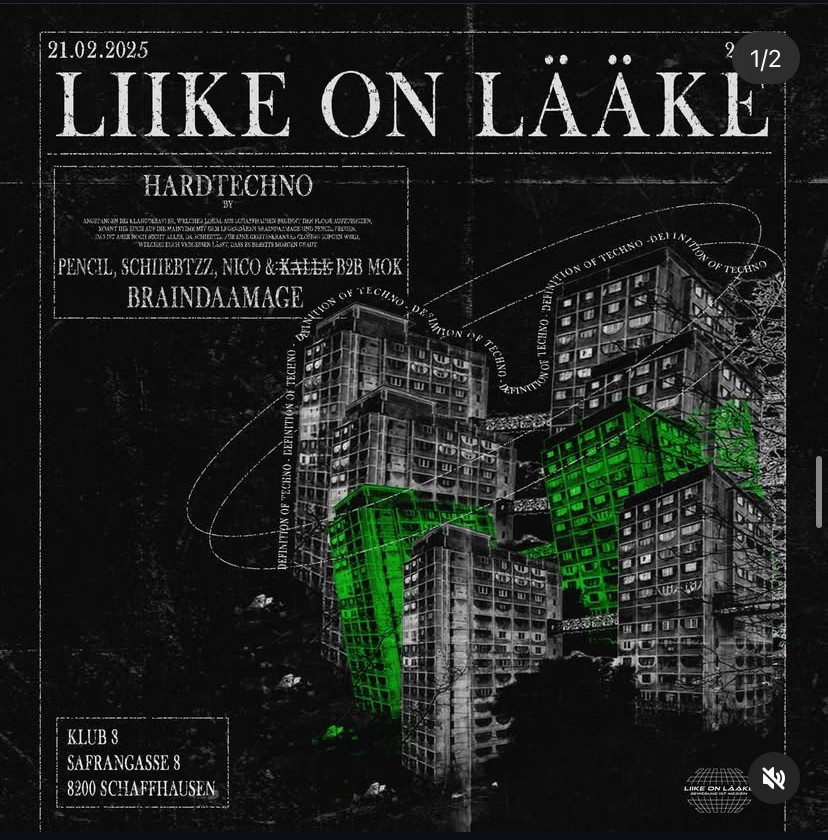 Mit unseren energiegeladenen Hard-Techno-Events bringen wir Stampfen auf ein neues Level – kompromisslos, roh und authentisch. Unser Ziel ist es, der lokalen Technoszene eine Plattform zu bieten, internationalen Artists nach Schaffhausen zu bringen und gleichzeitig unseren Residents eine Bühne zu geben, auf der sie sich entfalten können.