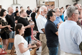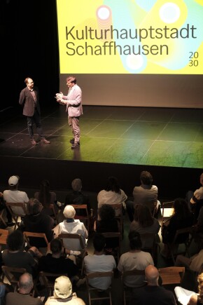 Rund 60 Personen folgten der öffentlichen Einladung und informierten sich in der Kammgarn über den aktuellen Stand des Bewerbungsprozesses. In je zwei unterschiedlichen Diskussionsrunden wurden vielfältige Feedbacks zu den Eckpfeilern der Bewerbung und zu einzelnen konkreten Fragestellungen und Programmideen gesammelt: Es ging um die Mission und das Motto des Projekts und dabei auch um die umstrittene Frage, ob der Leitspruch am Schaffhauser Schwabentor, «Lappi, tue d’Augen uf», eine gute Ausgangslage für ein Motto bietet oder nicht. Es wurde diskutiert, welche Konstellationen der Zusammenarbeit in Schaffhausen vielversprechend wären; wie das Potential leer stehender Gebäude in den Gemeinden aktiviert werden könnte; wie der Rhein bespielt werden soll bzw. welche Bühne er noch brauchen könnte; und wie garantiert werden kann, dass die Kulturhauptstadt nachhaltig und transformativ wirkt, als Labor und Versprechen für die Zukunft.